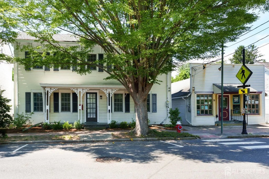 This is a property of great flexibility and possibilities. It offers easy access to restaurants, the Cranbury Public Library and the Cranbury School. The present owners converted the house back to a single-family residence from its previous use as a dress shop. The interior has been repainted, and the oldest part of the house retains its original doors, baseboards and moldings. It offers four bedrooms or may function as three bedrooms and a home office. The primary suite includes a large walk-in closet with washer/dryer hookups, and an en-suite bathroom with a large stall shower and radiant heat. The other bedrooms are served by a bathroom tastefully redecorated in period with a pedestal sink, black and white penny tiles, and a tub with shower. The large, sunny living room includes a ceiling-mounted video projector and Brazilian cherry floors. The eat-in kitchen is appointed with maple cabinets, granite counter-tops, stainless-steel appliances, an island, and a built-in desk. A formal dining room and powder room round out the first floor. Adjacent to the house and connected by a breezeway is a retail building that was used for many years as a candy and ice-cream store. It is leased to a tenant of long standing for $1,000 per month. Why not let someone else help pay your mortgage? The third building on the property is a detached garage with three large bays. The lot is L-shaped with the house fronting on N Main St and the garage fronting on Bunker Hill. The bulk requirements for the Village Commercial Zone indicate this property is large enough to subdivide into two conforming lots - one fronting on N. Main St. and one on Bunker Hill. A subdivision will require a formal application to the Township. The living, working, and investment possibilities this property offers are limited only by your imagination.