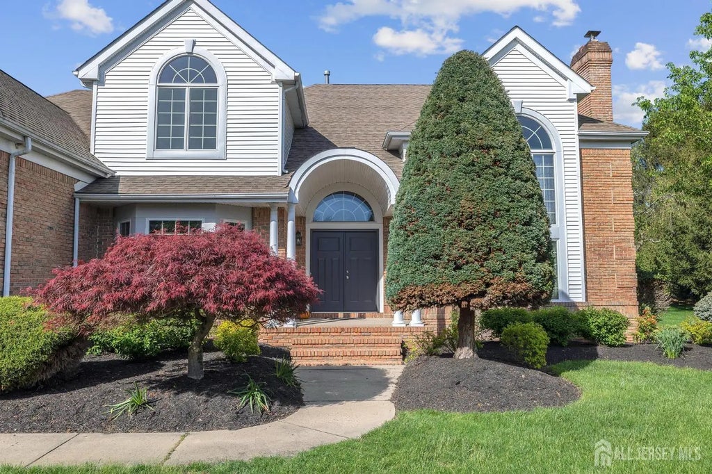 An additional entrance in the northwest enhances the appeal of this extraordinary colonial residence at 4 Stults Drive, set in one of Plainsboro Township's most serene and desirable wooded enclaves. Surrounded by natural woodlands and a meandering stream, this beautifully landscaped property offers a rare combination of elegance, privacy, and craftsmanship. The stately brick and stucco exterior opens to a grand two-story foyer with gleaming hardwood floors and abundant natural light. The spacious living room features a soaring cathedral ceiling and a dramatic floor-to-ceiling stone fireplace, perfect for both entertaining and relaxing. An adjacent formal dining room, detailed with crown molding and a bay window, leads to a gourmet kitchen outfitted with stainless steel appliances, custom tile flooring, a Palladian window, and skylights. A sunlit breakfast room opens to an expansive deck, overlooking lush gardens. The step-down family room and private study, both with French doors, offer additional versatile living spaces. Upstairs, the luxurious master suite boasts dual walk-in closets and a spa-inspired bath with a soaking tub and oversized shower. Three additional bedrooms share a fully renovated bath with premium finishes. The full high-ceiling basement provides limitless potential for future expansion. Completing the home are a three-car side-entry garage, recessed lighting, and peaceful outdoor spaces. Ideally located within the top-rated West Windsor-Plainsboro School District, and just minutes from Princeton, shopping, and transit to NYC, 4 Stults Drive is a refined retreat offering comfort, space, and timeless charm.